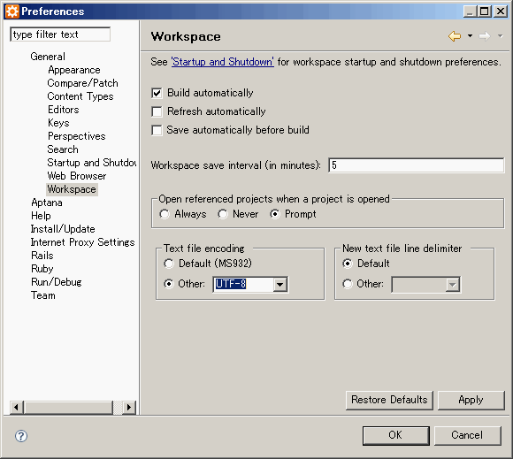 [Window] - [Preferences] - [General] - [Workspace] - [Text file encoding]¤òUTF-8¤ÇÀßÄê¤ËÀßÄꤷ¤Þ¤¹¡£